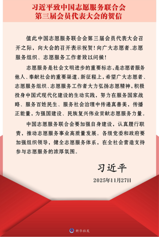2025年11月28日,中共中央总书记、国家主席、中央军委主席习近平致信祝贺中国志愿服务联合会第三届会员代表大会召开,强调要大力弘扬志愿精神,传递真善美,传播正能量,为强国建设、民族复兴伟业贡献志愿服务力量。