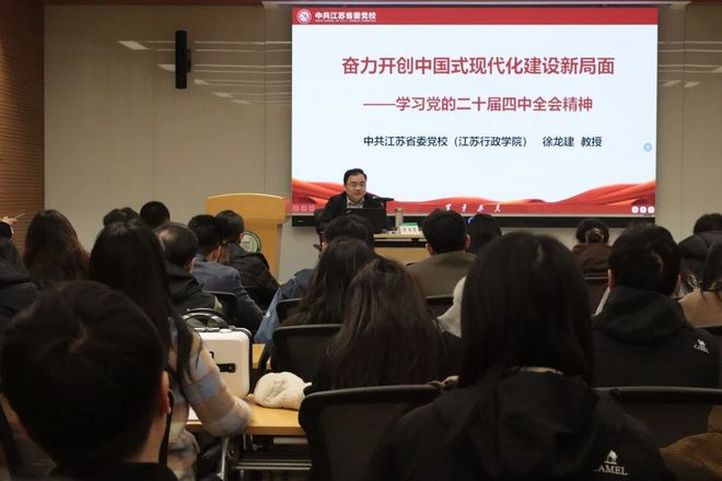 开班仪式结束后,中共江苏省委党校科学社会主义教研部副主任、徐龙建教授以《奋力开创中国式现代化建设新局面——学习党的二十届四中全会精神》为题,为全体学员系统解读全会的重要意义、“十五五”时期发展的战略定位与目标任务等内容。