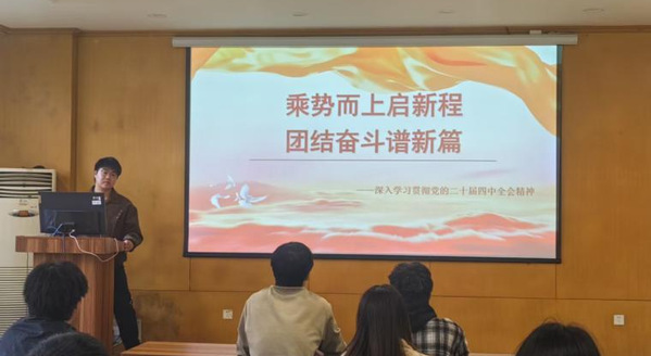 党的二十届四中全会于10月20日至23日在北京胜利召开,为新时代新征程党和国家事业发展擘画宏伟蓝图,吹响了乘势而上推进中国式现代化的奋进号角。为引导土木工程学院团员青年深刻领会党的二十届四中全会核心要义与实践要求,切实把思想和行动统一到党中央决策部署上来,南京林业大学土木工程学院团委紧扣“奋进‘十五五’青春挺膺担当”主题,通过主题团日全覆盖、专题宣讲深解读、骨干研讨凝共识三大形式,开展系列学习宣传活动,推动党的二十届四中全会精神入脑入心、落地生根。