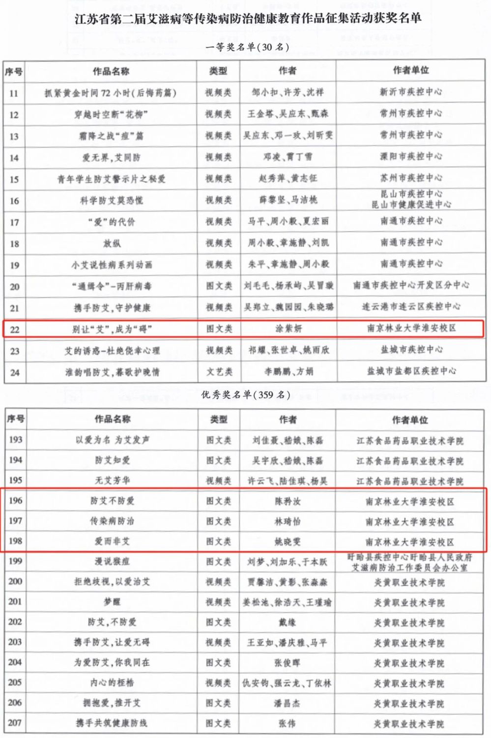 为贯彻落实《江苏省遏制与防治艾滋病“十四五”行动计划》, 广泛传播艾滋病防治健康知识,2024年7月至12月,我省疾控局、省教育厅联合组织开展了江苏省第二届艾滋病等传染病防治健康教育作品征集活动。我校积极响应号召,精心组织师生参与,经省级评审,最终斩获佳绩:淮安校区图文类作品涂紫妍创作的《别让艾,成为碍》荣膺一等奖;陈矜汝的《防艾不防爱》、林琦怡的《传染病防治》和姚晓雯的《爱而非艾》均获优秀奖。